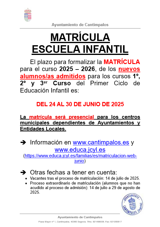 LISTADO DEFINITIVO ADMITIDOS Y MATRÍCULA ESCUELA INFANTIL 2025-2026 nuevos alumnos de 0 a 3 años (1º, 2º y 3er curso) - 24 a 30 de junio de 2025