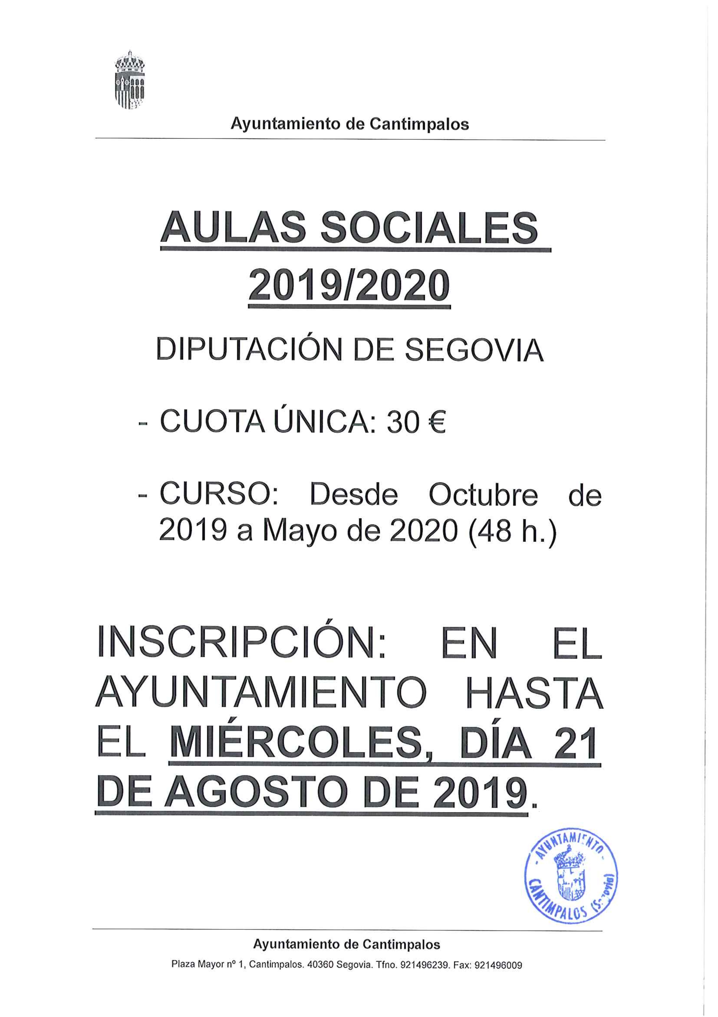 Inscripción en el Ayuntamiento: HASTA 21 DE AGOSTO DE 2019.