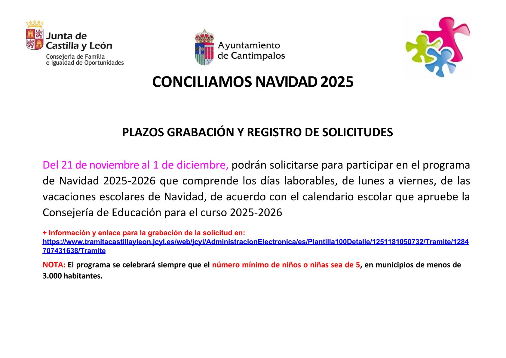 El programa se celebrará siempre que el número mínimo de niños o niñas sea de 5, en municipios de menos de 3.000 habitantes.