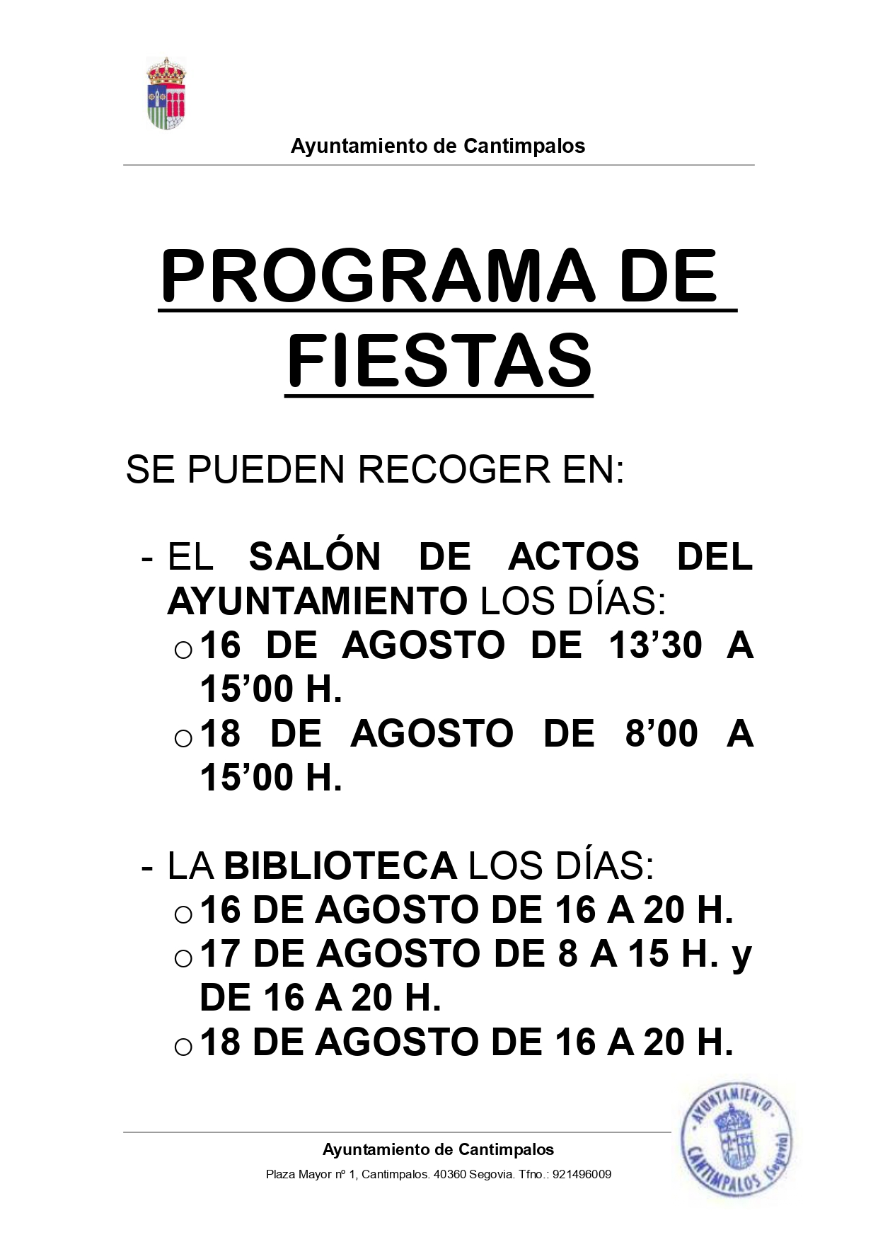 Puntos de recogida y horarios para recoger el horario de fiestas. SE PUEDEN RECOGER EN: - EL SALÓN DE ACTOS DEL AYUNTAMIENTO LOS DÍAS: o 16 DE AGOSTO DE 13’30 A 15’00 H. o 18 DE AGOSTO DE 8’00 A 15’00 H. - LA BIBLIOTECA LOS DÍAS: o 16 DE AGOSTO DE 16 A 20 H. o 17 DE AGOSTO DE 8 A 15 H. y DE 16 A 20 H. o 18 DE AGOSTO DE 16 A 20 H