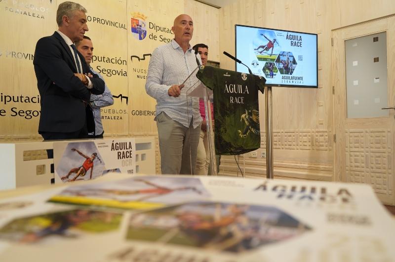 El próximo 23 de junio, Aguilafuente recibirá a cerca de un centenar y medio de corredores de toda España, que se darán cita en la primera edición de la Águila Race, prueba de obstáculos y resistencia con la que colabora la Diputación y que ha sido presentada esta mañana en rueda de prensa por el diputado de Deportes, Óscar Moral, el alcalde de la localidad, Luis Mariano García, y los organizadores Pablo Hurtado y Juan Manuel Herrero, quien además es corredor de la liga AOCO.